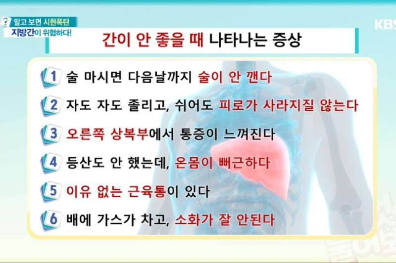 구취가 늘어나는 것도 간 기능 저하의 증상 중 하나이다. 담즙이 제대로 분비되지 않아 소화에 문제가 생기면 체내에서 생성된 독소와 가스가 위로 역류해 구취가 발생하게 된다. 이런 경우 양치질을 한다고 해서 구취가 사라지지는 않습니다. 냄새는 입에서 나는 것이 아니라 위에서 나는 것이기 때문이다. 6. 만성피로 간이 좋지 않을 때 마지막으로 말씀드릴 증상은 피로입니다. 신진대사는 간의 기능 중 하나라고 말씀드렸는데요. 단백질, 탄수화물, 지방 등 영양소를 분해하고 합성하는 능력이 떨어지기 때문에 많이 먹어도 항상 영양결핍에 시달리게 되고, 이로 인해 만성피로가 발생하게 됩니다. 이로 인해 두통이나 코피가 자주 나는 분들도 계십니다. 지금까지 간기능 저하 증상에 대해 살펴보았습니다. 위에서 설명한 증상 중 하나라도 발생하거나 의심된다면 검사를 받는 것이 좋습니다. 간질환에는 간염, 간경변, 지방간, 간 농양, 간 혈관종, 간암 등 다양한 유형이 있습니다. 이러한 질병 중 일부는 심각하고 생명을 위협하므로 조기에 발견하고 치료하는 것이 중요합니다. 그렇다면 간 상태가 좋지 않을 때 증상을 예방하려면 어떻게 해야 할까요? 물론 규칙적이고 균형 잡힌 식사를 하고 규칙적으로 운동해야 합니다. 그리고 술을 자주 마시는 사람은 앞으로는 술을 자제하거나 줄여야 합니다. 비만과 과도한 음주는 지방간 질환을 일으키는 주요 요인이며, 지방간 질환이 장기간 지속되면 간경화로 진행될 수 있으므로 주의가 필요합니다. 참고로 간 기능 저하 증상을 예방할 수 있는 식품으로는 구기자, 두부, 부추, 강황, 오트밀, 브로콜리, 커피, 녹차, 아몬드, 시금치, 블루베리 등이 있으므로 이러한 식품을 규칙적으로 섭취하는 것도 도움이 됩니다. 하지만 이러한 음식을 과식하지 않도록 주의해야 합니다. 예를 들어, 커피는 과음과 폭식으로 인한 손상으로부터 간을 보호하고 간암 발병률을 감소시킨다는 연구 결과가 있지만, 하루에 3잔 이상 커피를 마시면 실제로 두통, 불면증, 심계항진 등의 부작용을 일으킬 수 있다. 지금까지 간이 나빠지면 나타나는 증상에 대해 살펴보았습니다. 지방간을 비롯한 기타 간질환은 무증상이거나 초기에 매우 경미한 증상을 보이기 때문에 인지하기가 매우 어렵습니다. 그러므로 정기적으로 건강검진을 받고, 의심되는 증상이 있을 경우에는 병원에서 한 번 이상 검사를 받아보시기 바랍니다.