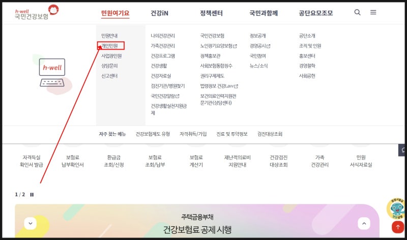 건강보험 홈페이지에 들어가셔서 ‘민원여기’ 메뉴를 클릭하시면 ‘개인민원’ 버튼을 누르시면 됩니다.