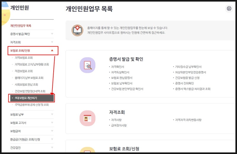 보험료 조회/신청란에서 “4가지 보험료 계산” 버튼을 클릭합니다.