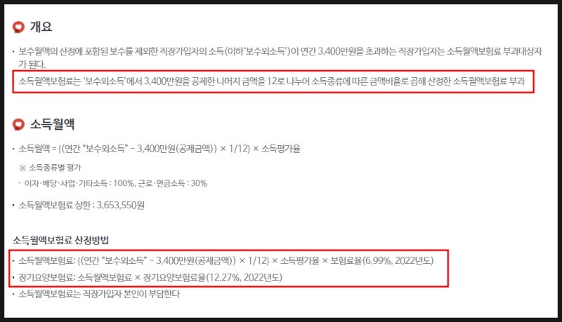 ● 비급여 소득이 3,400만원을 초과하는 가입자는 보험료를 추가로 납부하여야 하며, 이는 보수 외 소득이 3,400만원을 초과하는 건강보험료 산정기준입니다. 월 소득 보험료는 연간 미지급 소득에서 3,400원을 빼고 1/12로 나눕니다. 그 후 소득평가율에 보험료율(6.99%)을 곱하면 장기요양보험료율도 12.27%가 되는데 직장인이라면 주의해야 한다.로컬 사용자