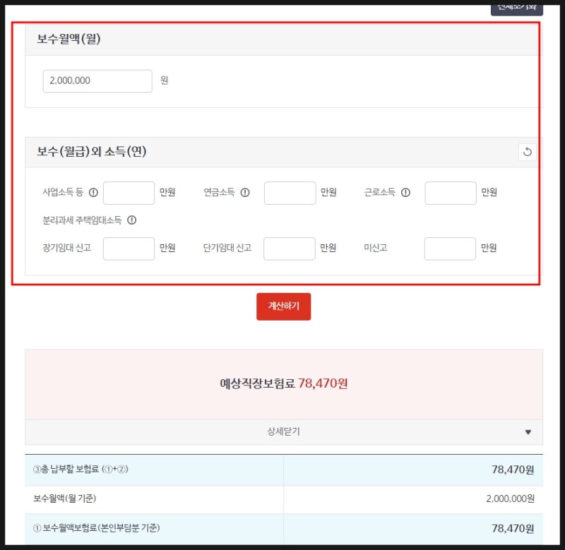 여기에서 건강 보험료를 볼 수 있고 지역 보험료와 고용 보험료 계산을 시뮬레이션할 수 있습니다. 또한 아래에서 연금 보험료, 산재 보험료 및 고용 보험료를 계산할 수 있습니다.